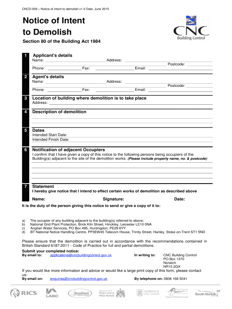 Get the free Notice of Intent to Demolish PDF Notice of Intent to Demolish - cncbuildingcontrol gov