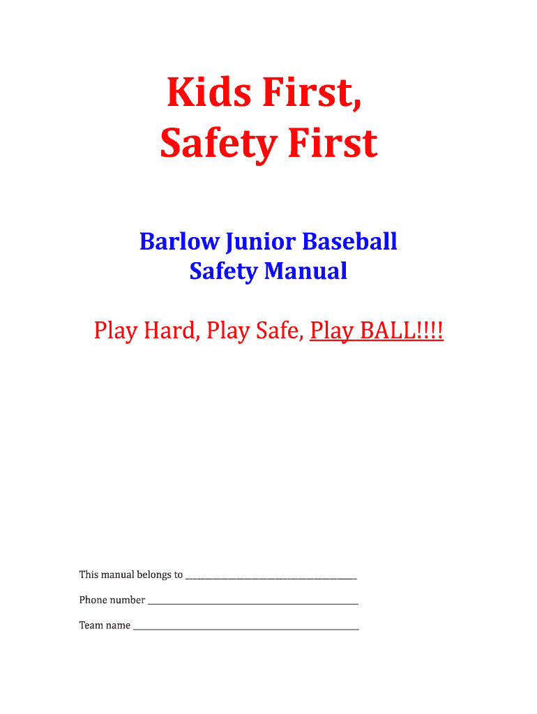 Kids First, Safety First Barlow Junior Baseball Safety Manual Play Hard, Play Safe, Play BALL!!!! This manual belongs to Phone number Team name 2015 Accident Reporting Log Today's Date of injury Time