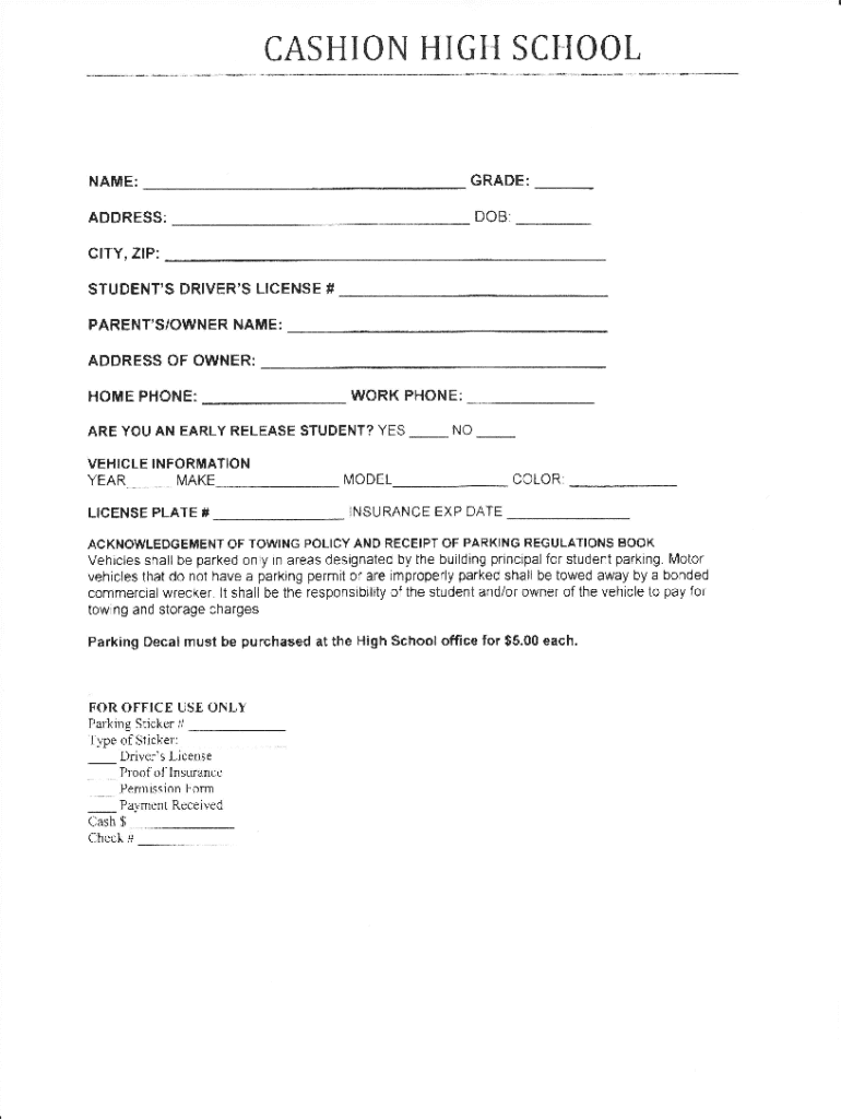 CASHION HIGH SCHOOLGRADE:NAME:DOB:ADDRESS: CITY. ZIP: STUDENT\'S DRIVER\'S LICENSE # PARENT\'S/OWNER NAME: ADDRESS OF OWNER: HOME PHONE:WORK PHONE:ARE YOU AN EARLY RELEASE STUDENT?YESNOVEHICLE INFORMATIONYEARMAKELICENSE
