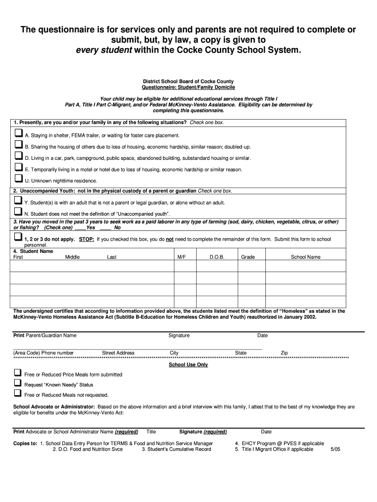 The Cocke County Student/Family Domicile Questionnaire is an educational form used by families and school officials to determine eligibility for additional educational services under Title I and Federal McKinney-Vento Assistance.