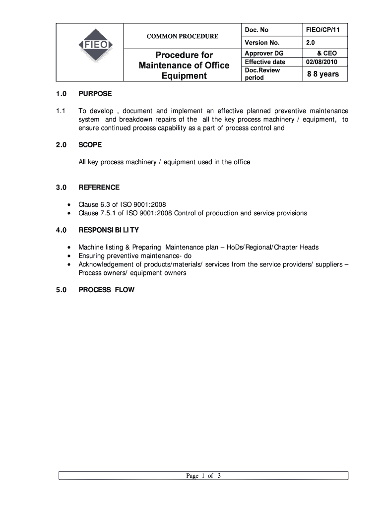COMMON PROCEDUREProcedure for Maintenance of Office Equipment. Nosier×CP/11Version No.2.0Approver DG Effective date Doc. Review period CEO 02×08/20108 8 years1.0PURPOSE1.1To develop, document and