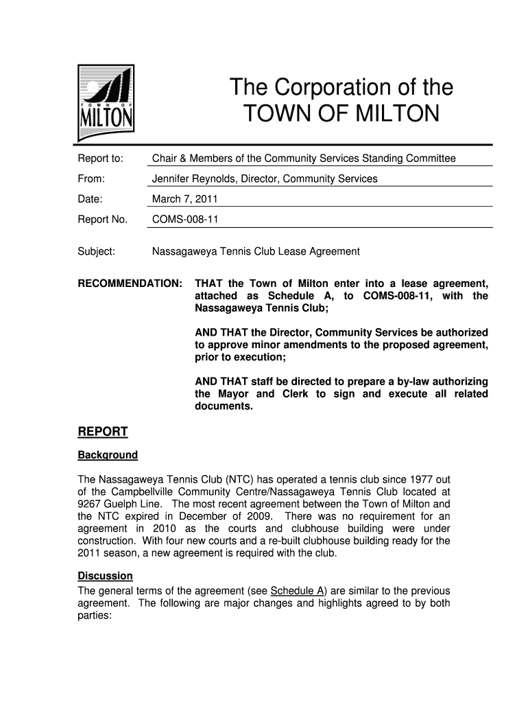 The Corporation of the TOWN OF MILTON Report to: Chair & Members of the Community Services Standing Committee From: Jennifer Reynolds, Director, Community Services Date: March 7, 2011, Report No.