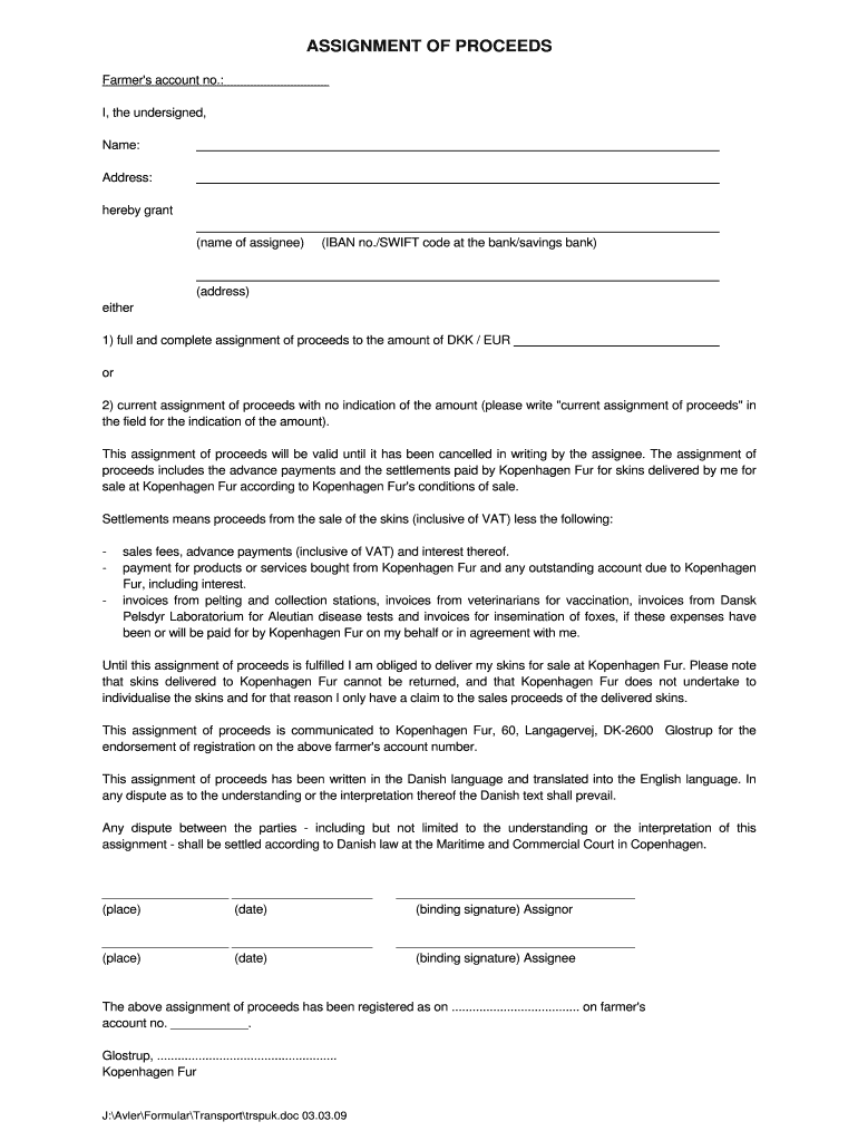 Get the free ASSIGNMENT OF PROCEEDS - Kopenhagen Fur