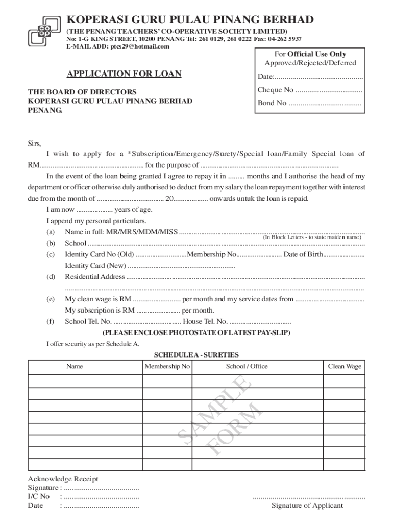 Get the free SAMPLE FORM - Penang Teachers' Co-operative Society