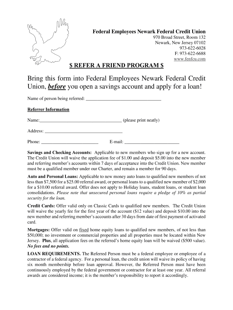 Federal Employees Newark Federal Credit Union 970 Broad Street, Room 132 Newark, New Jersey 07102 9736226028 F: 9736226688 www.fenfcu.com $ REFER A FRIEND PROGRAM $ Bring this form into Federal Employees