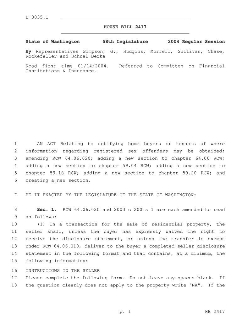 H3835.1 HOUSE BILL 2417 State of Washington 58th Legislature 2004 Regular Session By Representatives Simpson, G., Huggins, Morrell, Sullivan, Chase, Rockefeller and SchualBerke Read first time 01×14/2004.