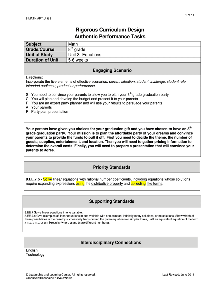 1 of 11 8.MATH.APT. Unit 3 Rigorous Curriculum Design Authentic Performance Tasks Subject Grade×Course Unit of Study Duration of Unit Math 8th grade Unit 3 Equations 56 weeks Engaging Scenario Directions: