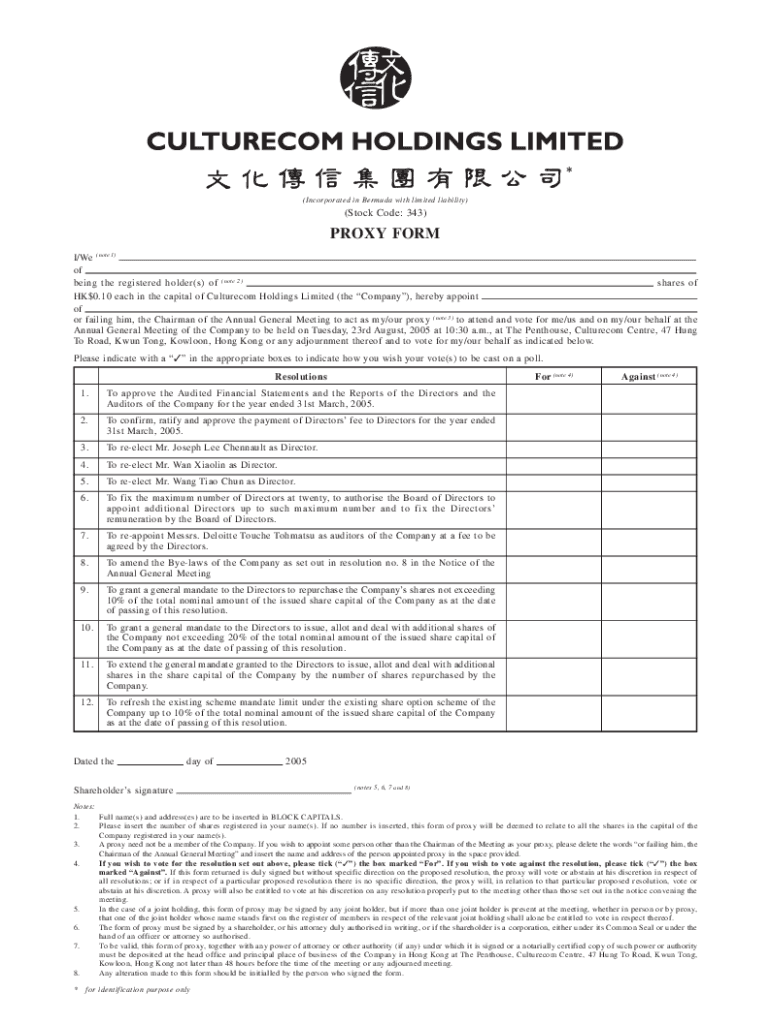 The Culturecom Proxy Form is a crucial document for shareholders of Culturecom Holdings Limited, enabling them to appoint a proxy to vote on their behalf at the Annual General Meeting (AGM). This form serves several essential purposes, including streamlining the voting process and ensuring active shareholder participation, even when in-person attendance isn’t possible. Understanding its significance is vital for every shareholder in Hong Kong.