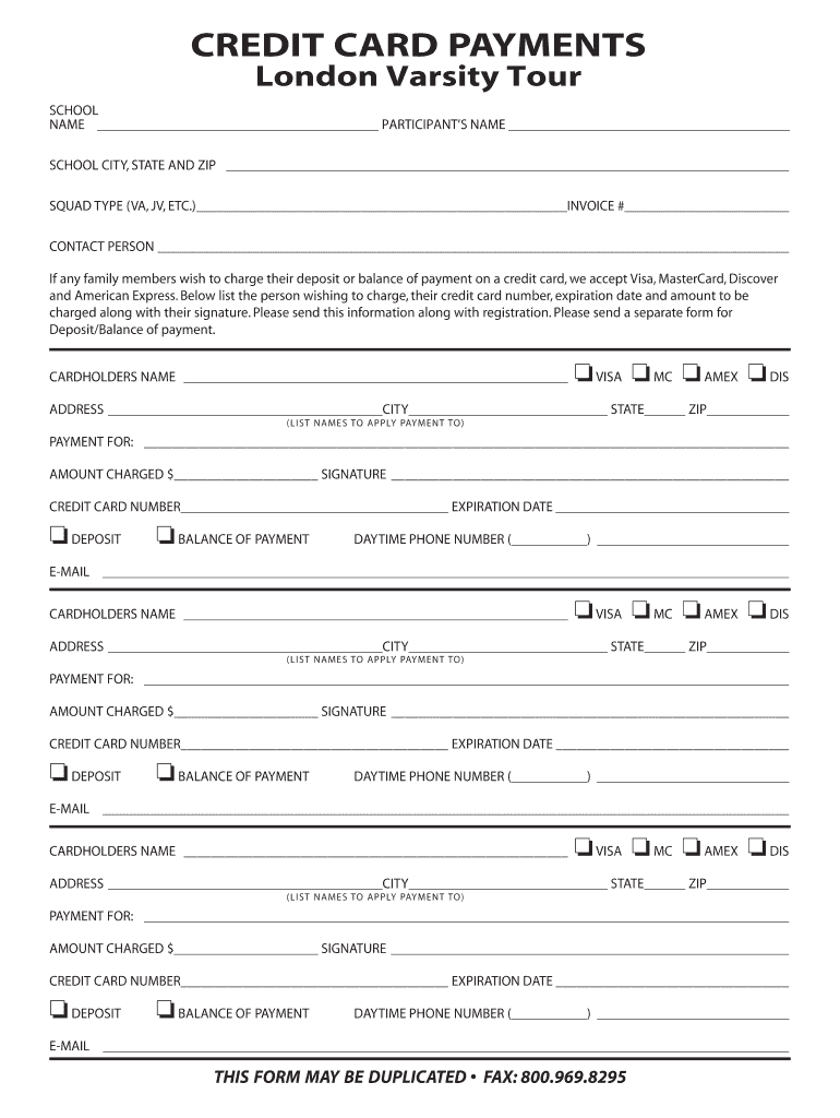 CREDIT CARD PAYMENTS London Varsity Tour SCHOOL NAME PARTICIPANTS NAME SCHOOL CITY, STATE AND ZIP SQUAD TYPE (VA, JV, ETC.) INVOICE # CONTACT PERSON If any family members wish to charge their deposit