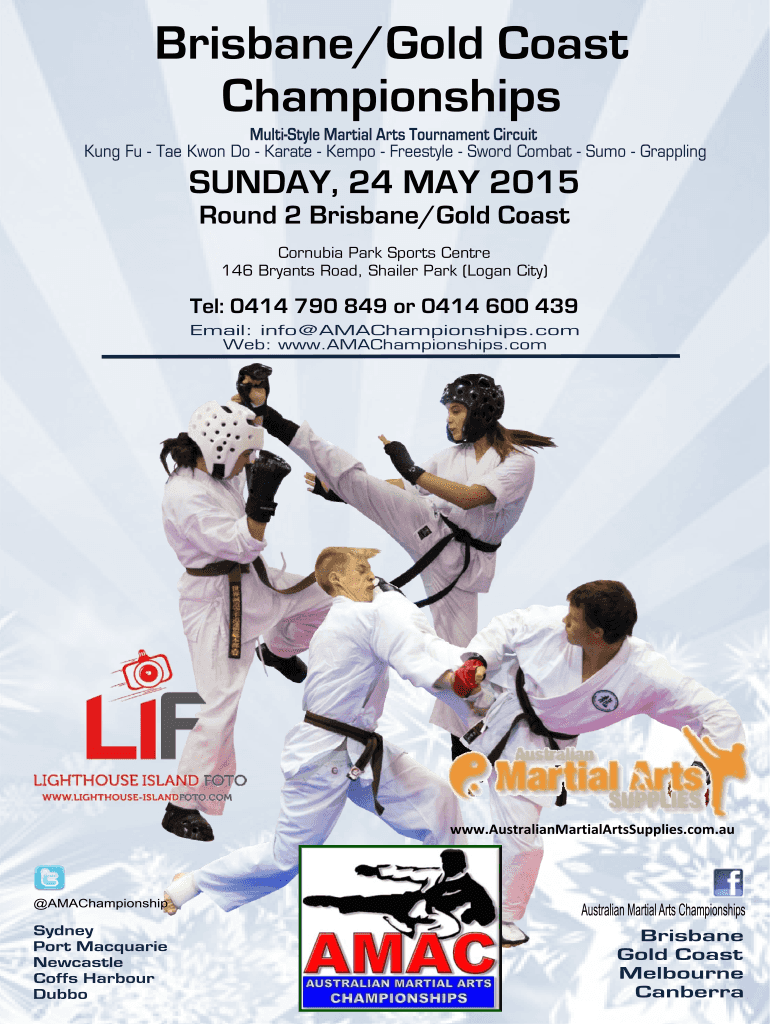 Brisbane×Gold Coast Championships SUNDAY, 24 MAY 2015 Round 2 Brisbane×Gold Coast Cornelia Park Sports Center 146 Bryant's Road, Sailer Park (Logan City) Tel: 0414 790 849 or 0414 600 439 www.AustralianMartialArtsSupplies.com.au