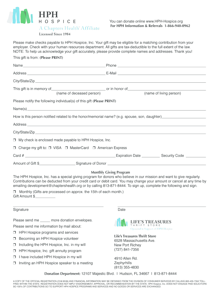 You can donate online www.HPHHospice.org For MPH Information & Referrals 18669400962 Please make checks payable to MPH Hospice, Inc. Your gift may be eligible for a matching contribution from your