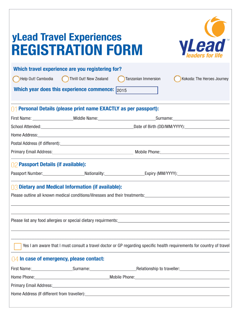 Lead Travel Experiences REGISTRATION FORM leaders for life Which travel experience are you registering for? Help Out! Cambodia Thrill Out! New Zealand Tanzanian Immersion Which year does this experience