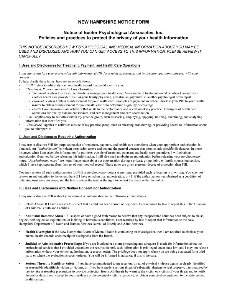 Get the free NEW HAMPSHIRE NOTICE FORM Notice of Exeter Psychological
