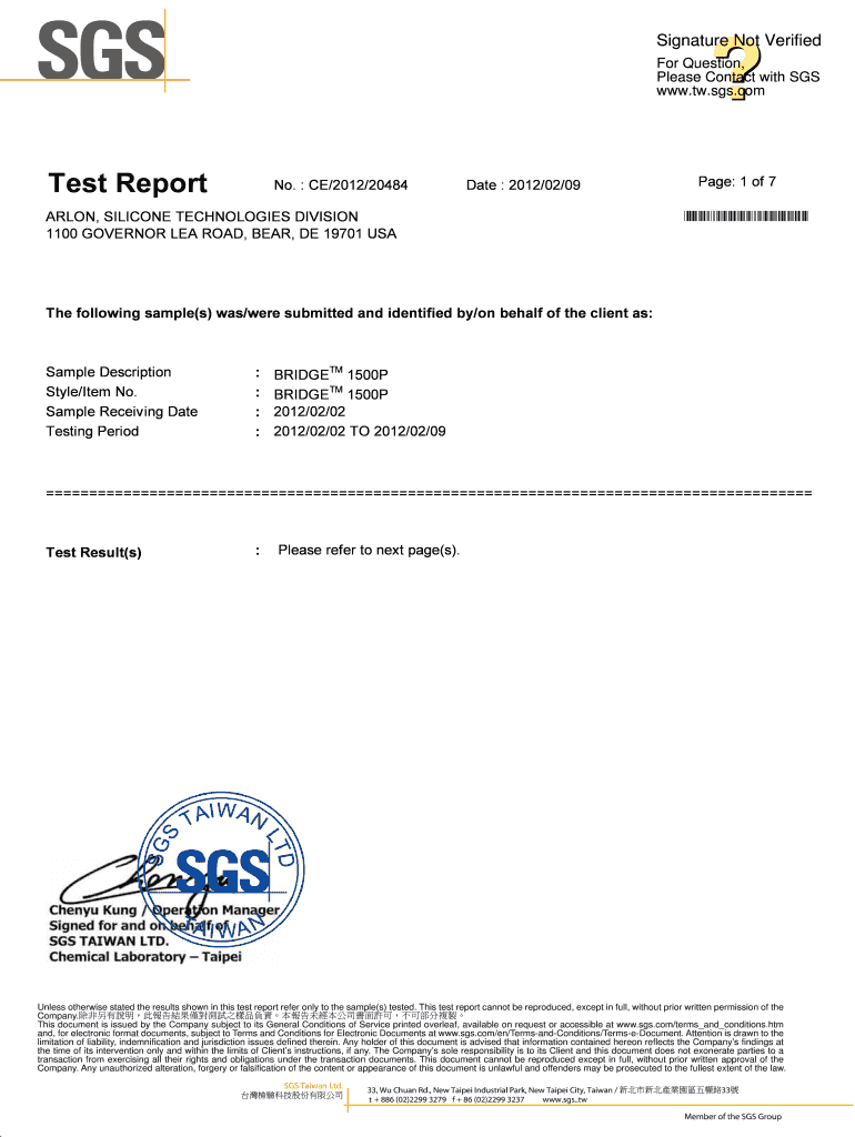 Fly signed by wmholetech. 2012.02.09 :38 CST Signature Not Verified For Question, Please Contact with SGS www.tw.sgs.com Test Report No. CE×2012×20484 Date : 2012×02/09 ARSON, SILICONE TECHNOLOGIES
