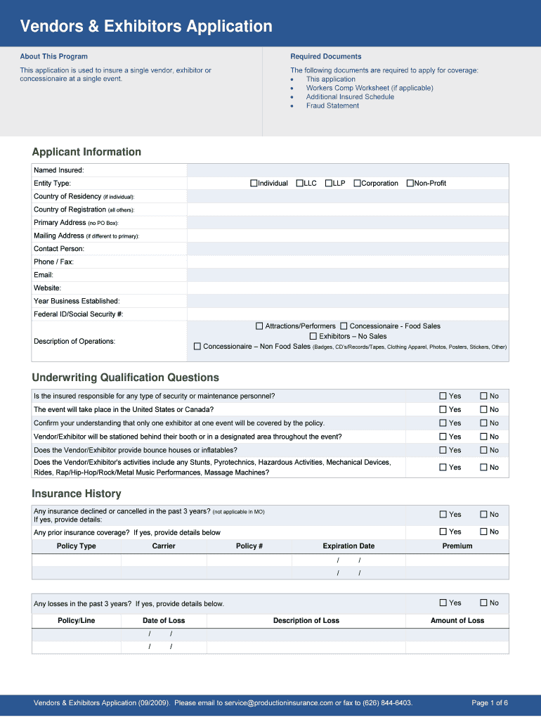 The Vendors & Exhibitors Application is a business form used by vendors, exhibitors, or concessionaires to obtain insurance coverage for a single event.