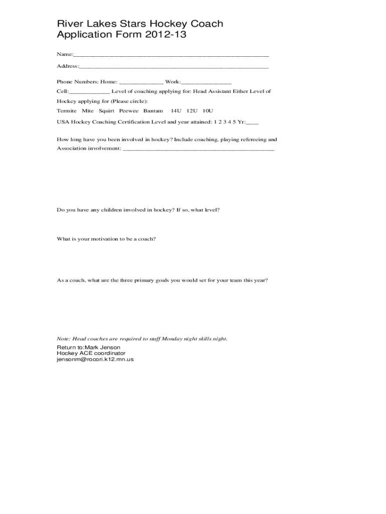 The information required on the River Lakes Stars Hockey Coach Application Form 2012-13 typically includes the applicant's name, contact details, coaching history, relevant certifications, and references.
