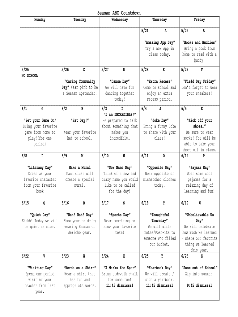 Seaman ABC Countdown Monday Tuesday Wednesday Thursday 5×21 A Amazing App Day Try a new App in class today. 5×25 NO SCHOOL 5×26 C Caring Community Day Wear pink to be a Seaman upstander! 6×1 G