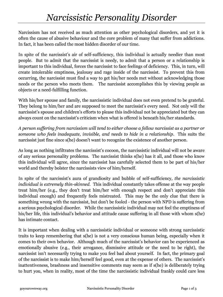 Overall, filling out narcissism has not received involves understanding the concept, gathering information, assessing behavior, and seeking professional help if necessary. This process can benefit individuals in various roles, including those in relationships with narcissistic individuals, mental health professionals, and individuals seeking personal growth.