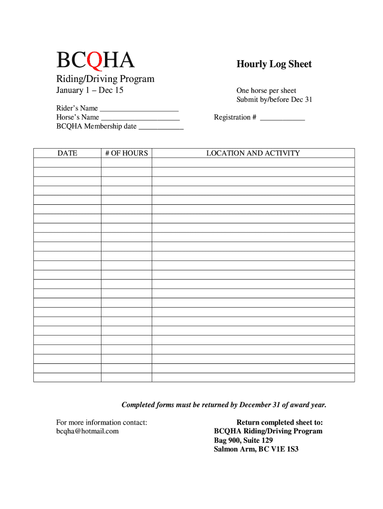 Get the free BCQHA Hourly Log Sheet Riding/Driving Program