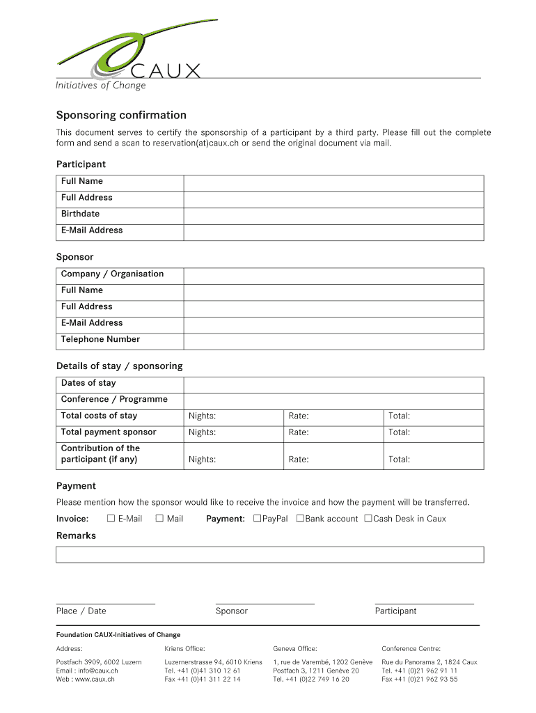 Sponsoring confirmation This document serves to certify the sponsorship of a participant by a third party. Please fill out the complete form and send a scan to reservation×at)aux.ch or send the original