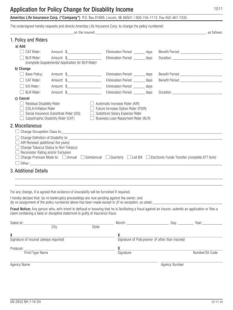 The Disability Income Policy Change Application is a crucial document for policyholders seeking to modify their disability income insurance with Ameritas Life Insurance Corp. This application enables users to request various changes, including the addition, modification, or cancellation of riders. It is essential for the application to be signed by the insured, as this signature may be complemented by evidence of insurability requirements, depending on the requested changes. The use of the term "disability income policy change application" effectively addresses the specific purpose of this form, while "ameritas life insurance policy change" highlights its affiliation with said insurance provider.