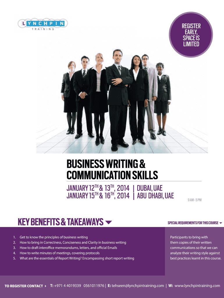 REGISTER EARLY, SPACE IS LIMITED BUSINESS WRITING & COMMUNICATION SKILLS JANUARY 12TH & 13TH, 2014 DUBAI, UAE JANUARY 15TH & 16TH, 2014 ABU DHABI, UAE KEY BENEFITS & TAKEAWAYS6 1. 2. 3. 4. 5. Get