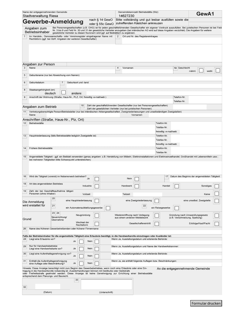 Name her entgegennehmenden Demand GewA1 Gemeindekennzahl Betriebsttte (Site) Stadtverwaltung Raise 14627230 GewerbeAnmeldung Annabel sum Betriebsinhaber 1 each 14 Good Bitter vollstndig UND gut lesser