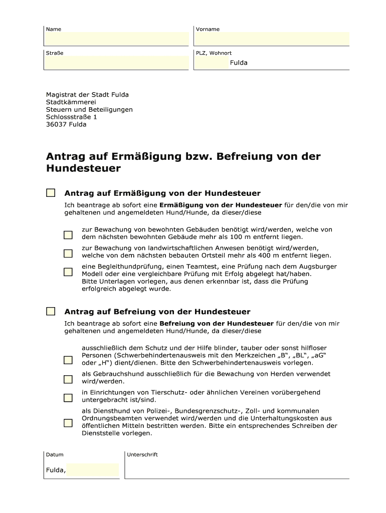 Holen Sie sich kostenlos Antrag auf Erm igung bzw. Befreiung von der Hundesteuer - in Fulda - fulda