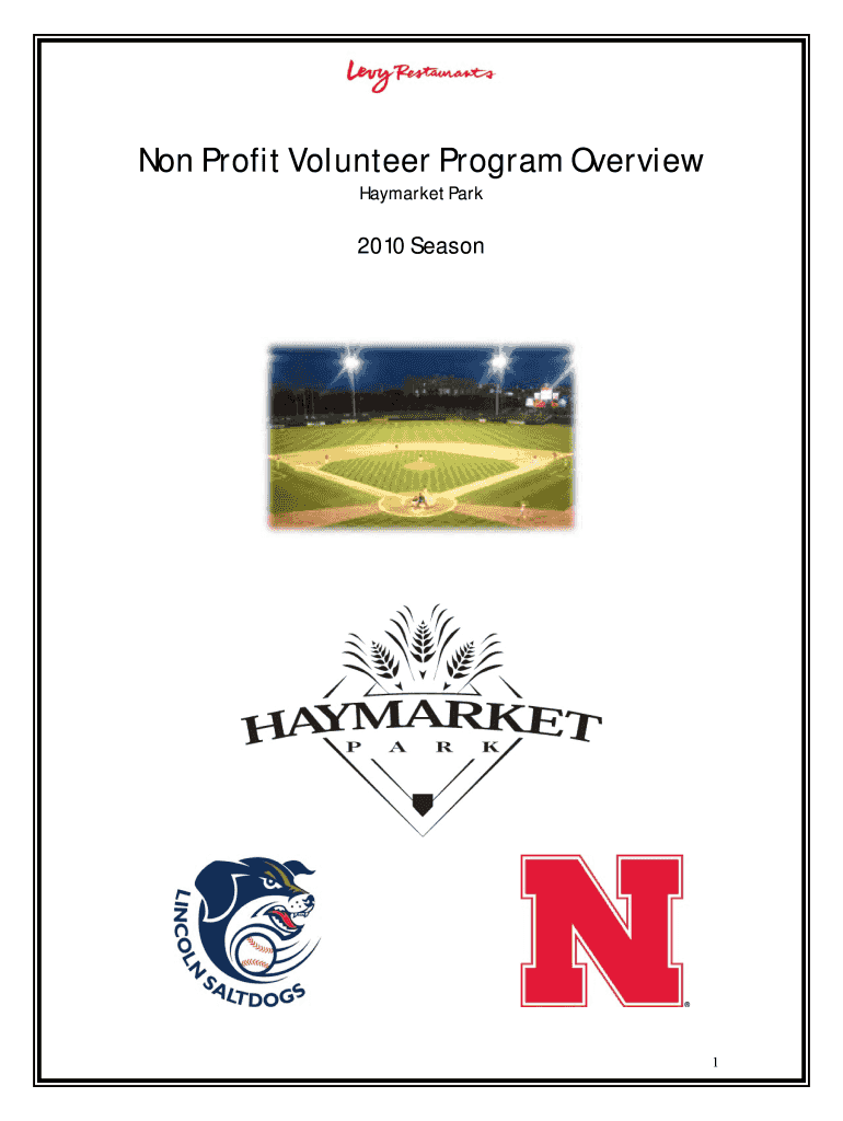 This document provides an overview of the Non-Profit Volunteer Program at Haymarket Park, outlining the requirements, expectations, and opportunities for non-profit organizations to participate in