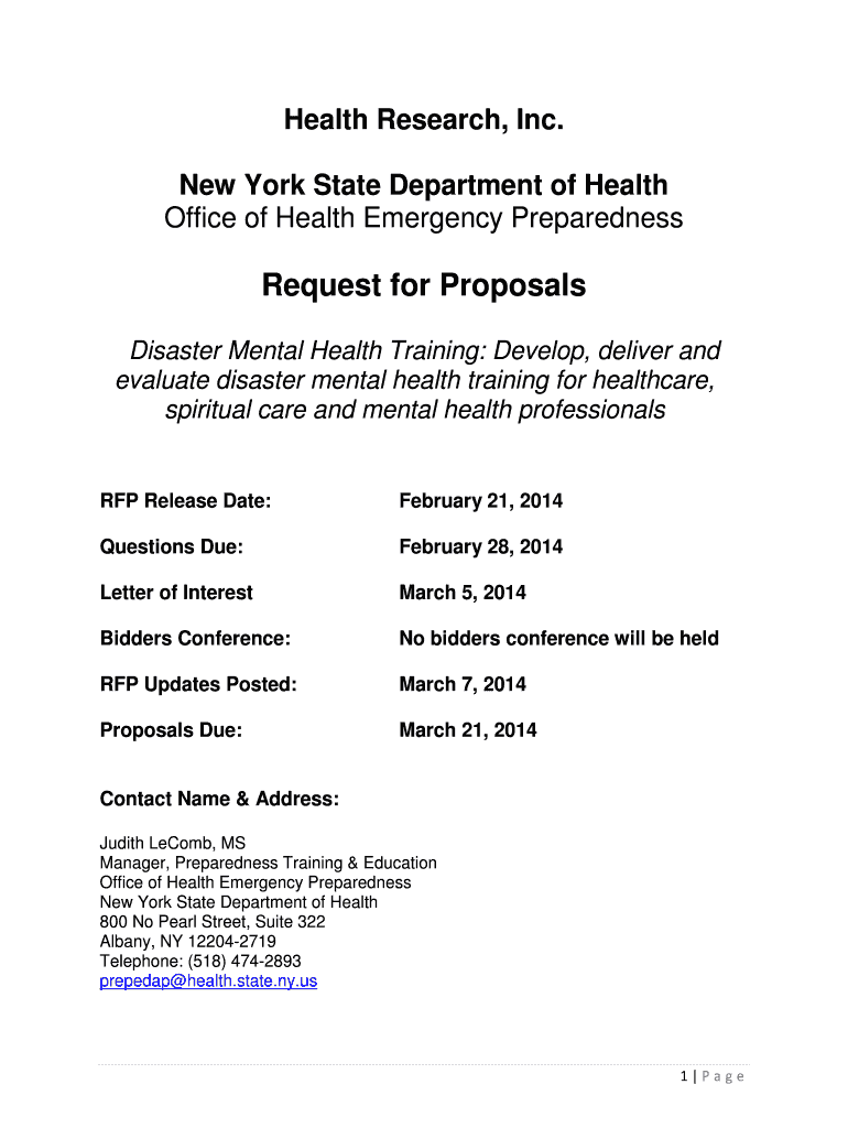 Health Research, Inc. New York State Department of Health Office of Health Emergency Preparedness Request for Proposals Disaster Mental Health Training: Develop, deliver and evaluate disaster mental