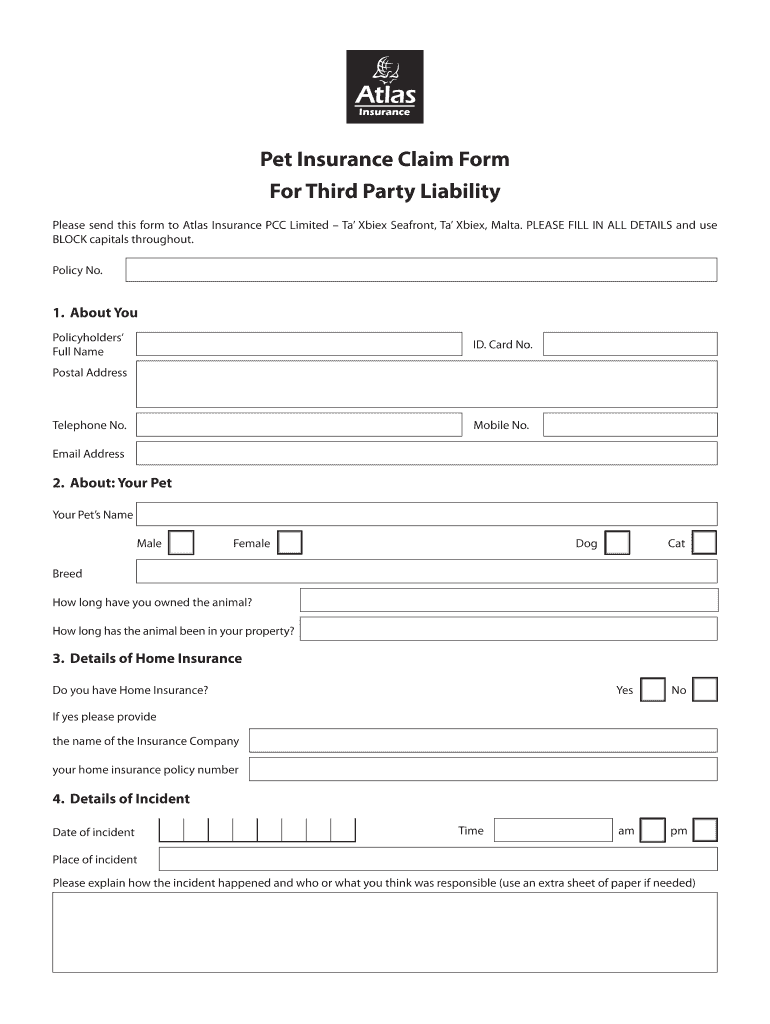 Pet Insurance Claim Form For Third Party Liability Please send this form to Atlas Insurance PCC Limited Ta Bier Seafront, Ta Bier, Malta. PLEASE FILL IN ALL DETAILS and use BLOCK capitals throughout.