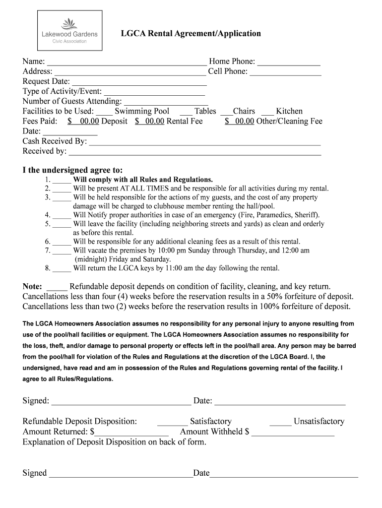 LGA Rental Agreement×Application Name: Home Phone: Address: Cell Phone: Request Date: Type of Activity×Event: Number of Guests Attending: Facilities to be Used: Swimming Pool Tables Chairs Kitchen