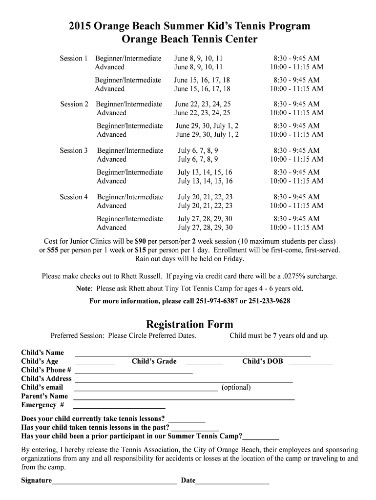 2015 Orange Beach Summer Kids Tennis Program Orange Beach Tennis Center Session 1 8:30 9:45 AM 10:00 11:15 AM June 15, 16, 17, 18 June 15, 16, 17, 18 8:30 9:45 AM 10:00 11:15 AM Beginner×Intermediate