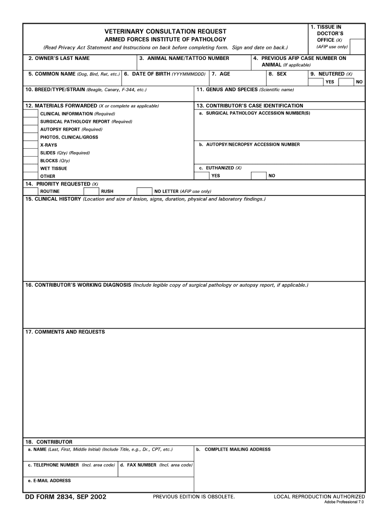 Get the free DD bFormb 2834 Veterinary Consultation Request September b2002b - dtic