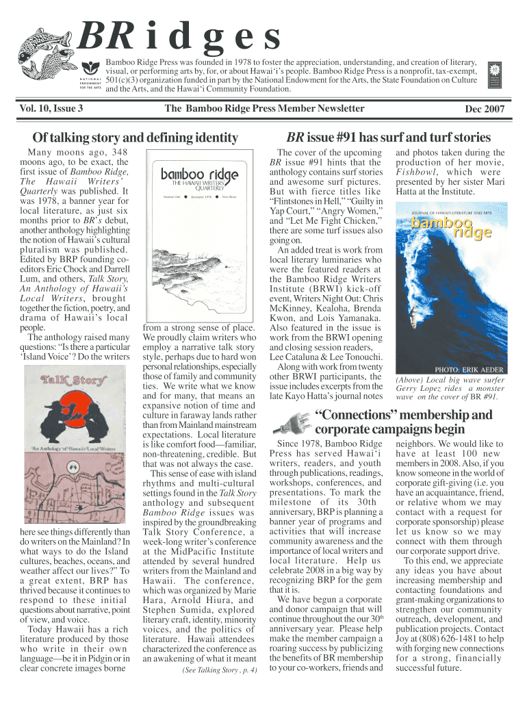 BR i d g e s Bamboo Ridge Press was founded in 1978 to foster the appreciation, understanding, and creation of literary, visual, or performing arts by, for, or about Hawaii's people. Bamboo Ridge