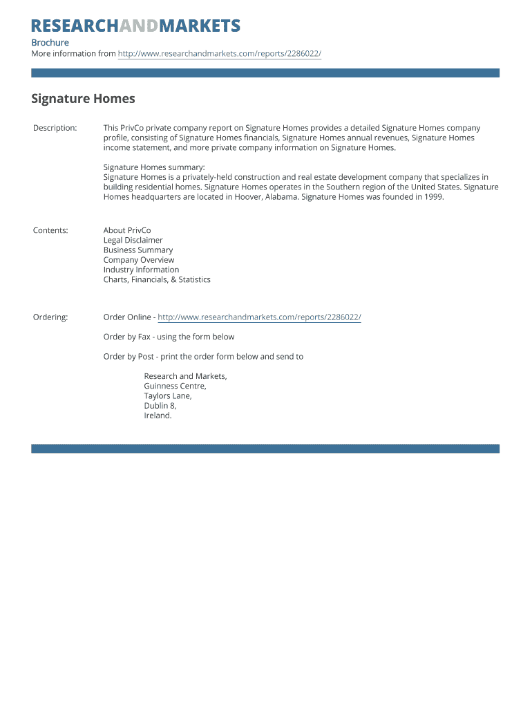Brochure More information from HTTP://www.researchandmarkets.com×reports×2286022/ Signature Homes Description: This Prince private company report on Signature Homes provides a detailed Signature