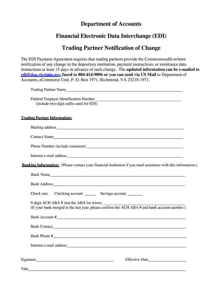 Department of Accounts Financial Electronic Data Interchange (EDI) Trading Partner Notification of Change The EDI Payment Agreement requires that trading partners provide the Commonwealth written