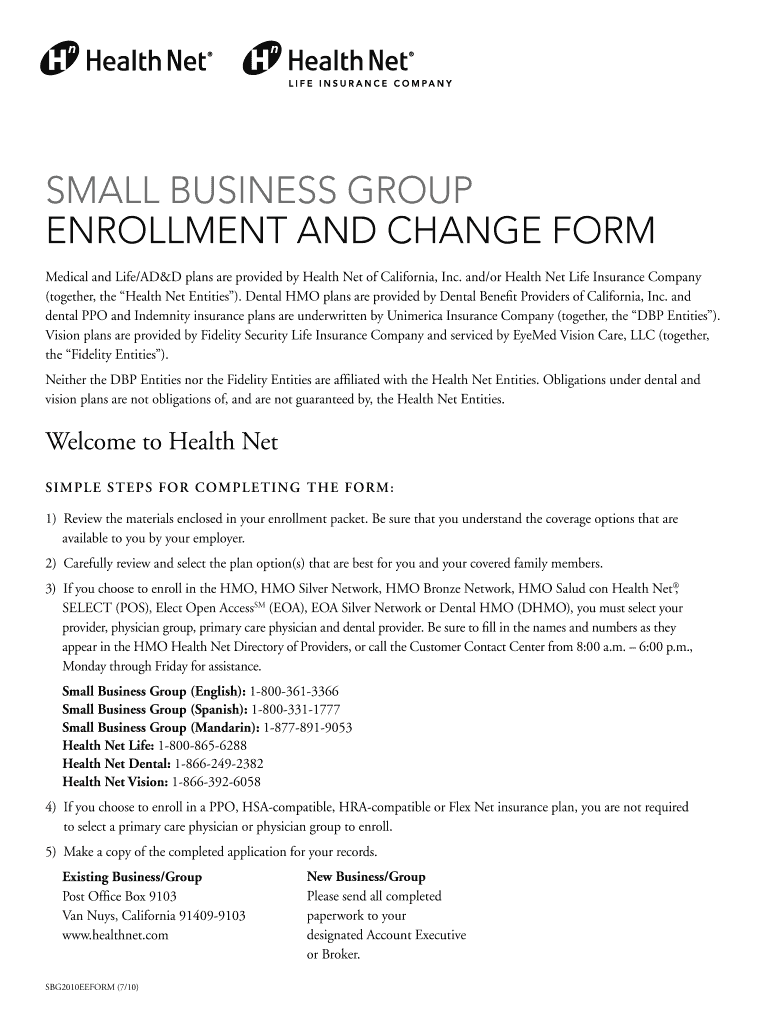Small Business Group Enrollment and Change Form Medical and Life×ADD plans are provided by Health Net of California, Inc. and×or Health Net Life Insurance Company (together, the Health Net Entities×.