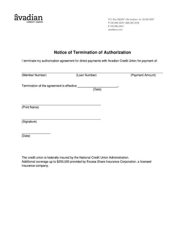 Notice of Termination of Authorization I terminate my authorization agreement for direct payments with Acadian Credit Union for payment of: (Member Number) (Loan Number) (Payment Amount) Termination