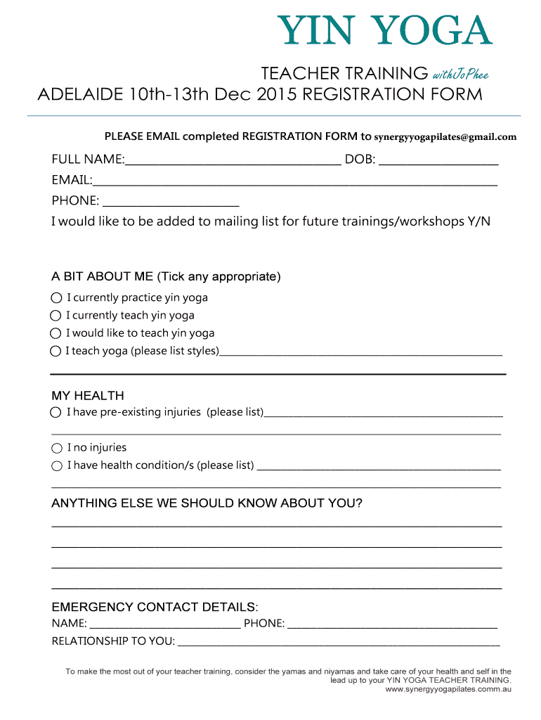 YIN YOGA TEACHER TRAINING withJoPhee ADELAIDE 10th-13th Dec 2015 REGISTRATION FORM PLEASE EMAIL completed REGISTRATION FORM to synergyyogapilates gmail.com FULL NAME: DOB: EMAIL: PHONE: I would like