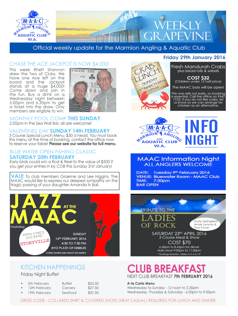 Weekly Grapevine Official weekly update for the Marion Angling & Aquatic Club Friday 29th January 2016 CHASE THE ACE JACKPOT IS NOW $4,000! This week Rhett Shannon drew the Two of Clubs. We have one