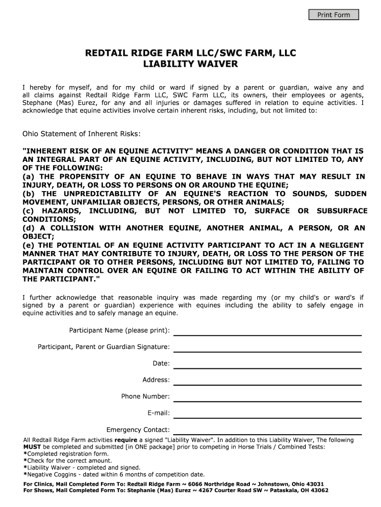 Get the free REDTAIL RIDGE FARM LLCSWC FARM LLC LIABILITY WAIVER