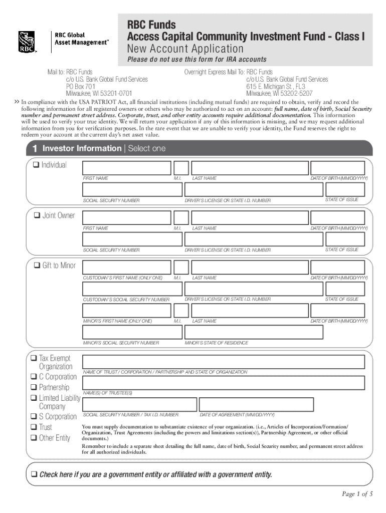 The RBC Funds New Account Application is crucial for individuals looking to establish an investment account. This form facilitates the investment process and ensures compliance with the USA PATRIOT Act by requiring specific personal information, including name, date of birth, Social Security number, and address. Accurately completing this form is essential for successful account registration and to meet regulatory standards.