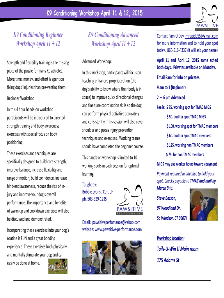 K9 Conditioning Workshop April 11 & 12, 2015 K9 Conditioning Beginner Workshop April 11 + 12 Strength and flexibility training is the missing piece of the puzzle for many K9 athletes. More time, money,
