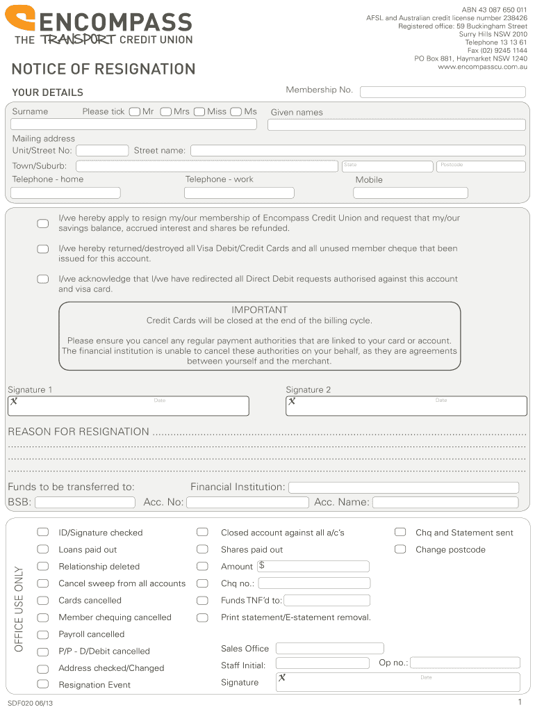 Get the free Notice of resignation - Encompass Credit Union