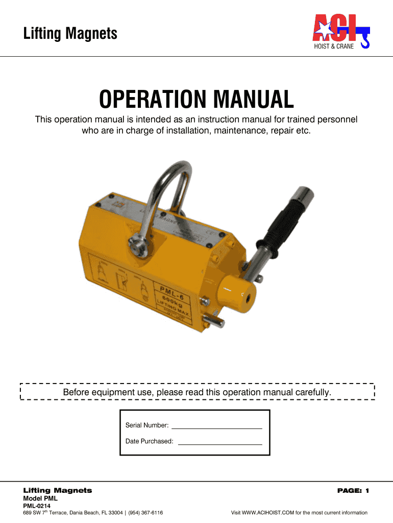 Lifting Magnets OPERATION MANUAL This operation manual is intended as an instruction manual for trained personnel who are in charge of installation, maintenance, repair etc. Before equipment use,
