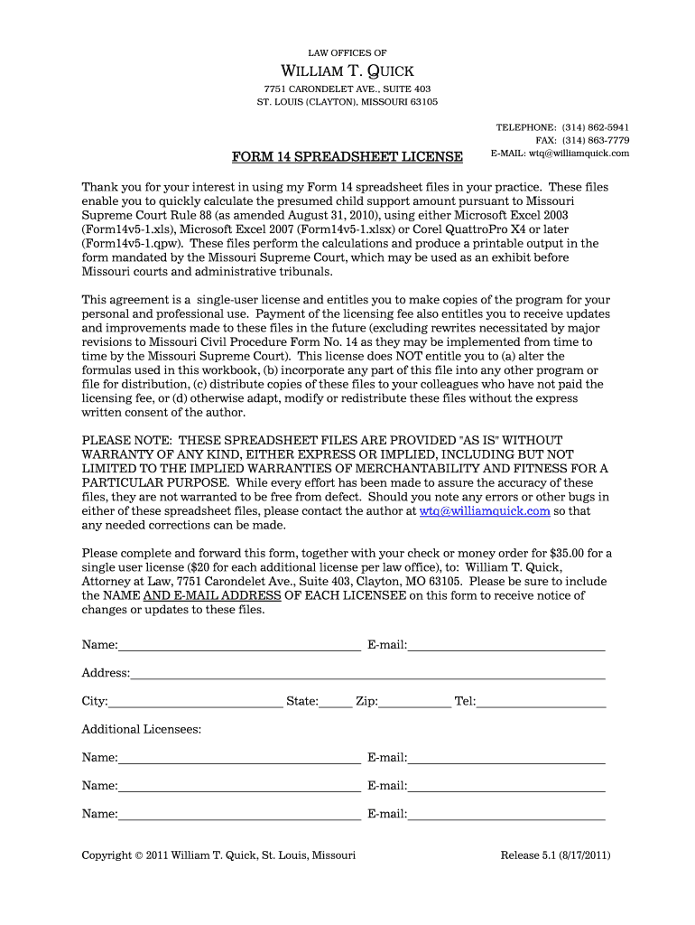 LAW OFFICES OF WILLIAM T. QUICK 7751 CARBONDALE AVE., SUITE 403 ST. LOUIS (CLAYTON×, MISSOURI 63105 FORM 14 SPREADSHEET LICENSE TELEPHONE: (314× 8625941 FAX: (314× 8637779 EMAIL: WTA williamquick.com