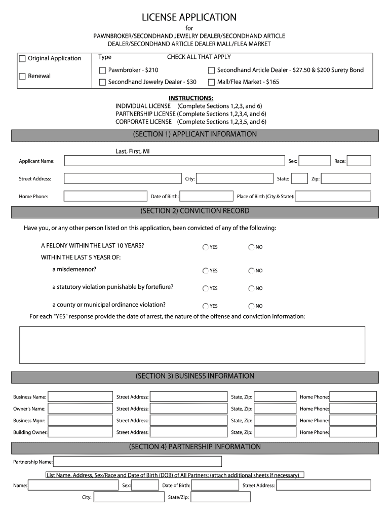 LICENSE APPLICATION for PAWNBROKER×SECONDHAND JEWELRY DEALER×SECONDHAND ARTICLE DEALER×SECONDHAND ARTICLE DEALER MALL×FLEA MARKET Type Original Application CHECK ALL THAT APPLY Pawnbroker $210