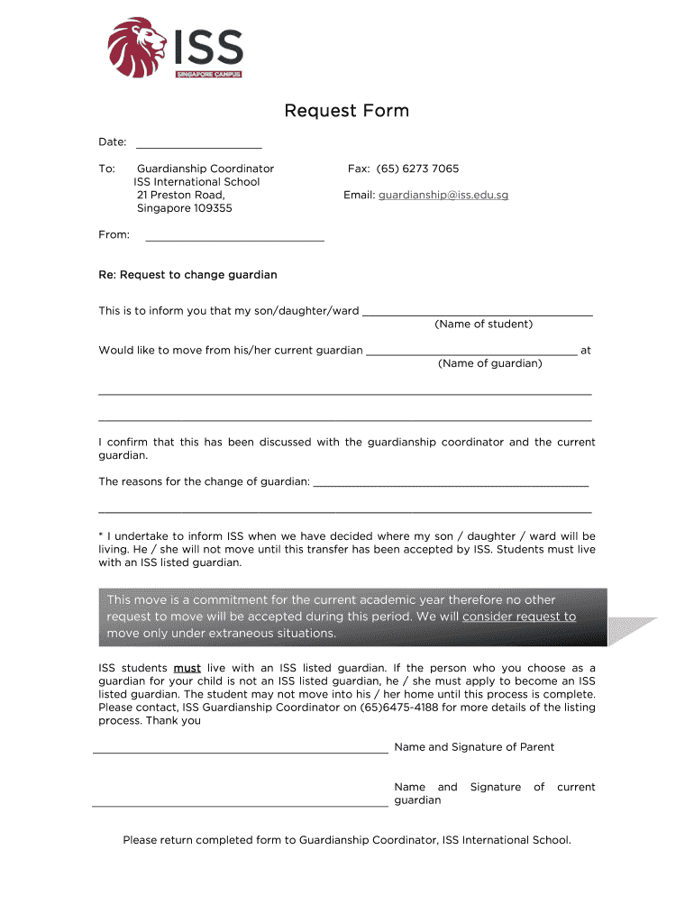 Request Form Date: To: Guardianship Coordinator ISS International School 21 Preston Road, Singapore 109355 Fax: (65× 6273 7065 Email: guardianship ISS.edu.SG From: Re: Request to change guardian
