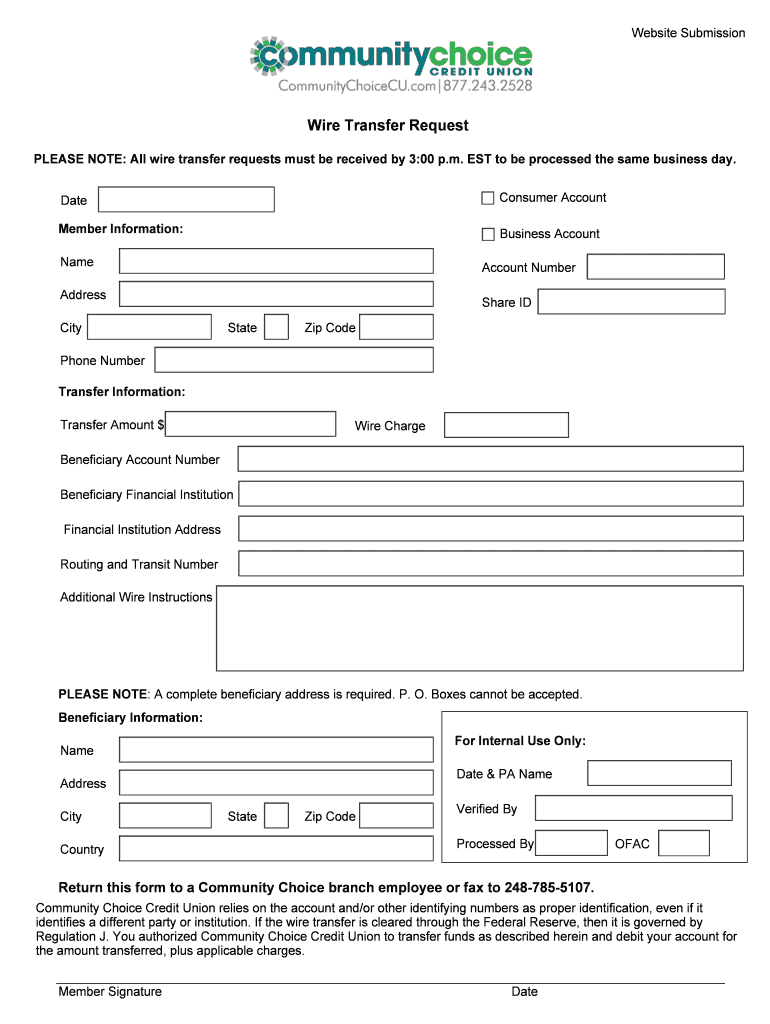 Website Submission Wire Transfer Request PLEASE NOTE: All wire transfer requests must be received by 3:00 p.m. EST to be processed the same business day. Date Consumer Account Member Information: